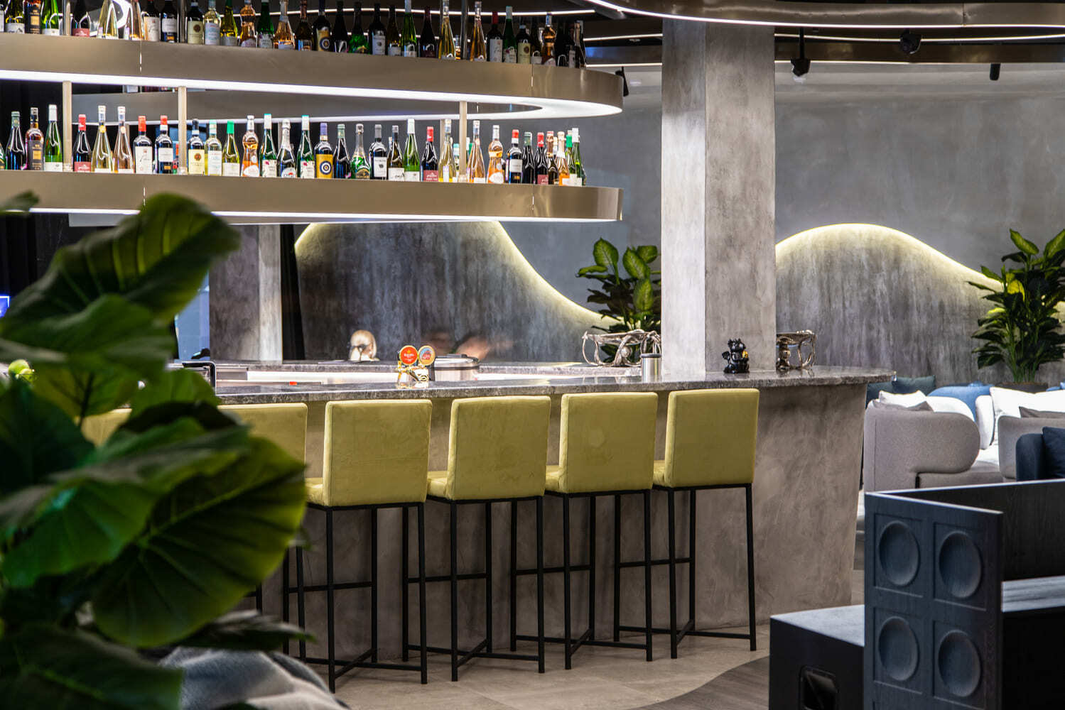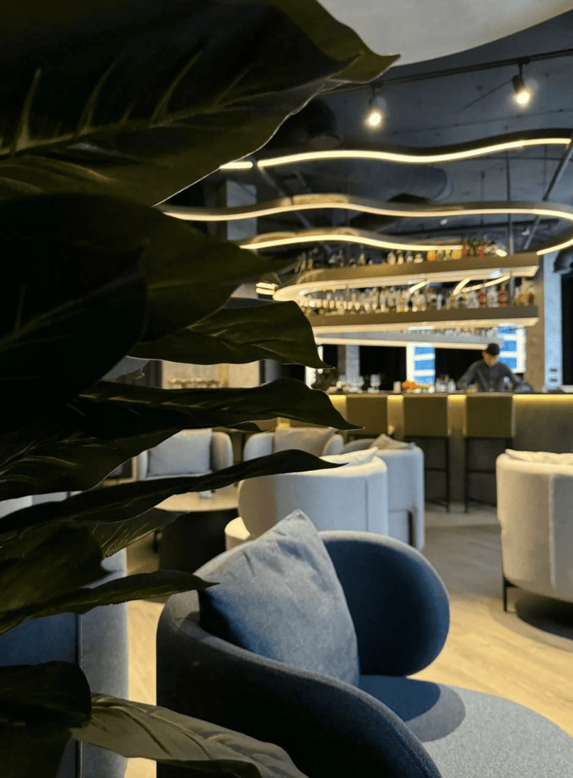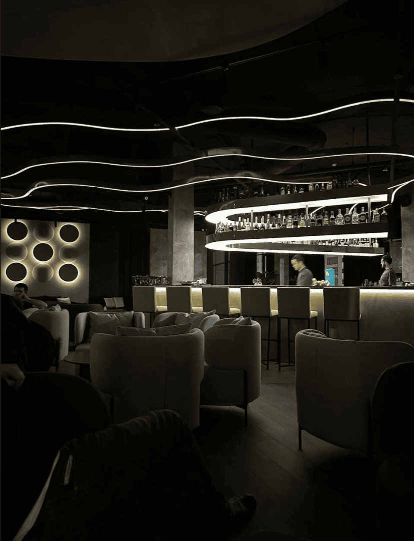 На фото видно, как волны создают над гостевыми столиками световые «дорожки», не слепят и не перегружают интерьер. Двухъярусная барная стойка с мягкой подсветкой собирает внимание посетителей, повышает читаемость ассортимента и визуально «протягивает» свет к бармену. В сумме мы получили современное освещение для HoReCa с выразительным декоративным эффектом и удобным управлением.