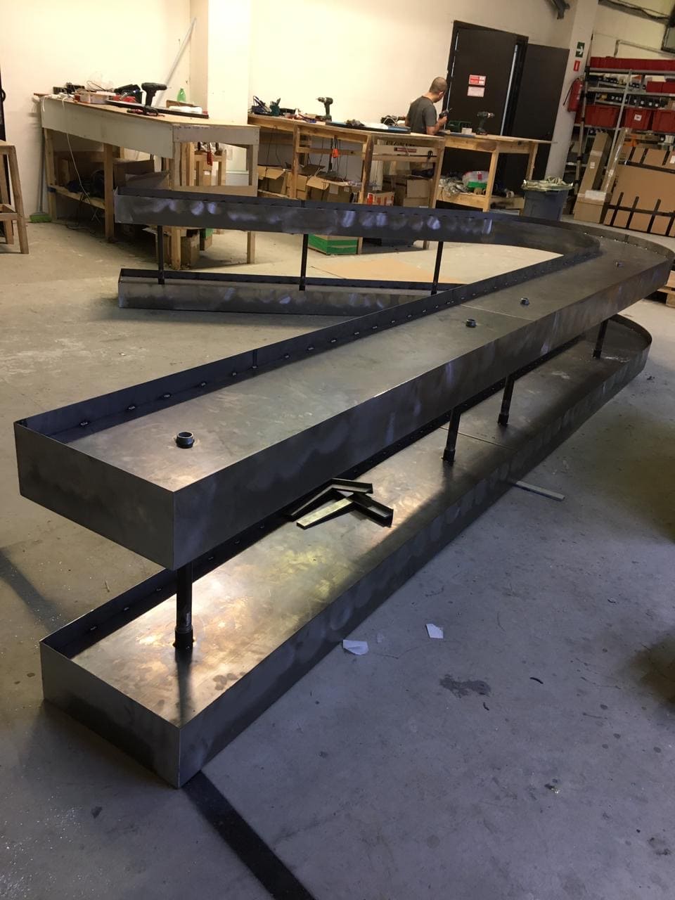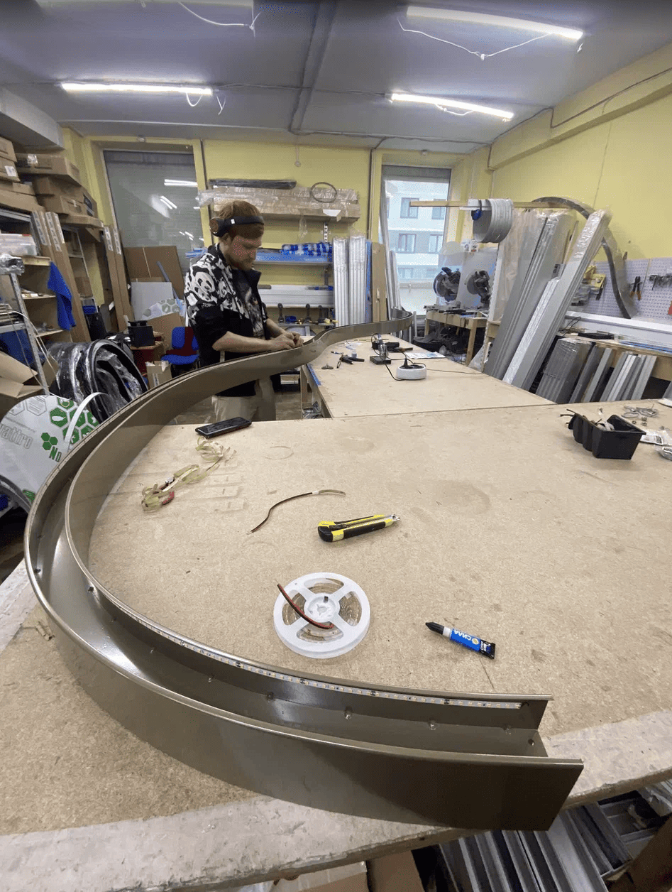 — Световая барная стойка: два яруса, металлический каркас, крепление на потолочные трубы, интегрированная светодиодная подсветка.