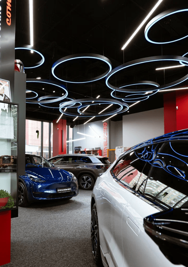 Освещение автосалона влияет на впечатление покупателей не меньше, чем витрины и демонстрационные подиумы. Для Tesla Центр в Москве мы изготовили и поставили светодиодные светильники в форме колец с RGB-подсветкой. Такое светодиодное освещение подчёркивает линии кузова, создаёт фирменную атмосферу и гибко подстраивается под задачи шоурума.