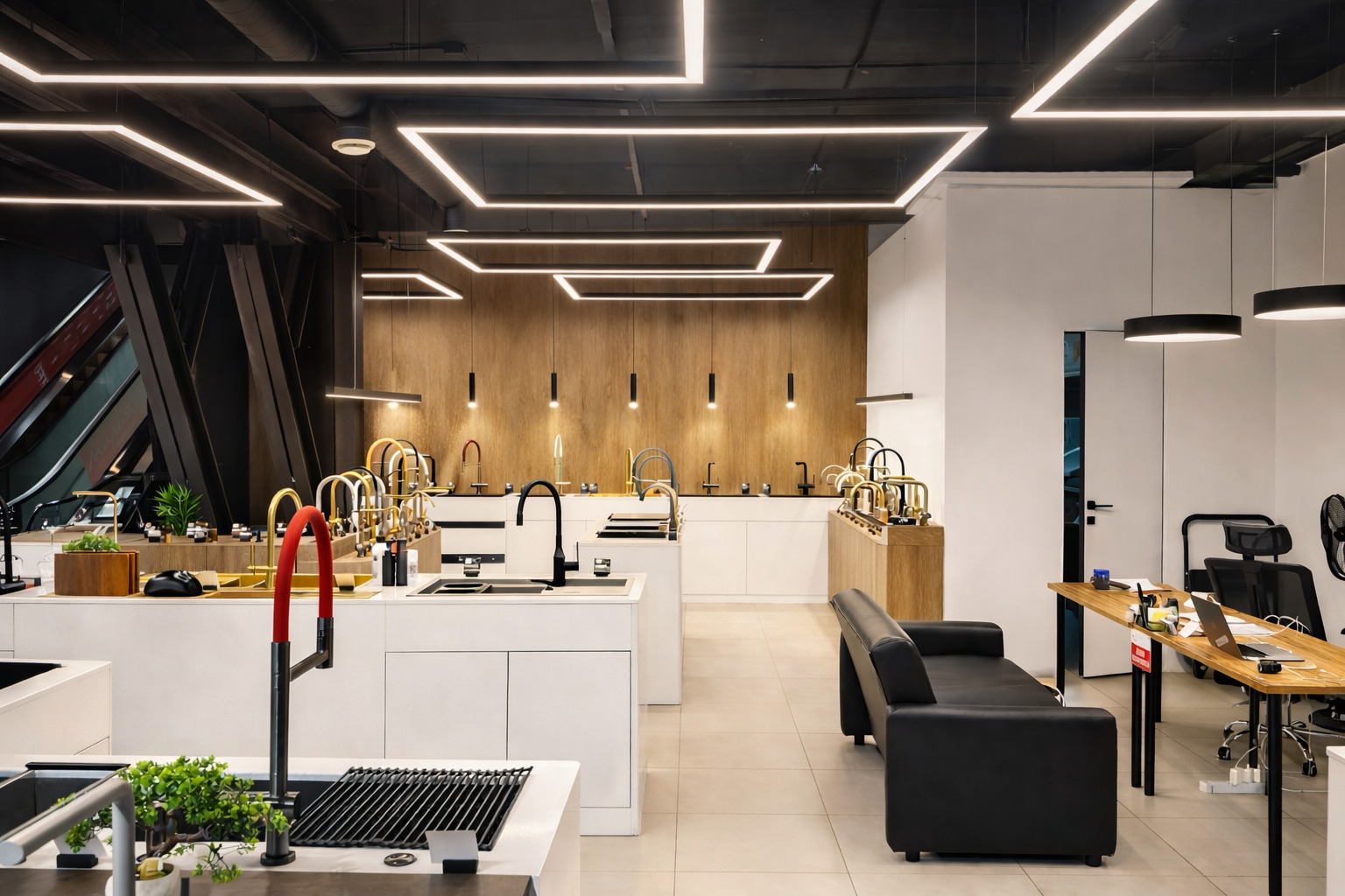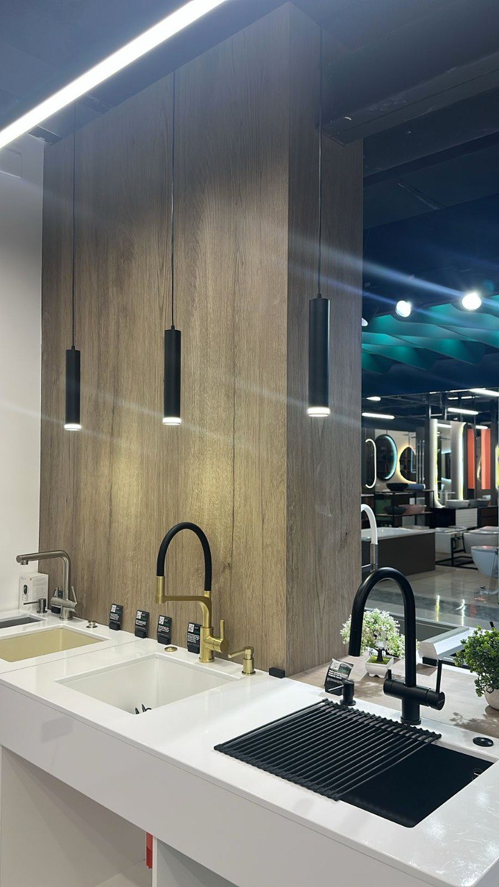 Во-вторых, создать акцентное освещение для ключевых зон. Некоторые экспозиции требуют дополнительной подсветки — например, витрины с дизайнерскими смесителями премиум-класса или демонстрационные стенды с с раковинами различных форм и стилей. Светодиодные светильники для магазинов с направленным светом помогают выделить такие зоны и привлечь к ним внимание.