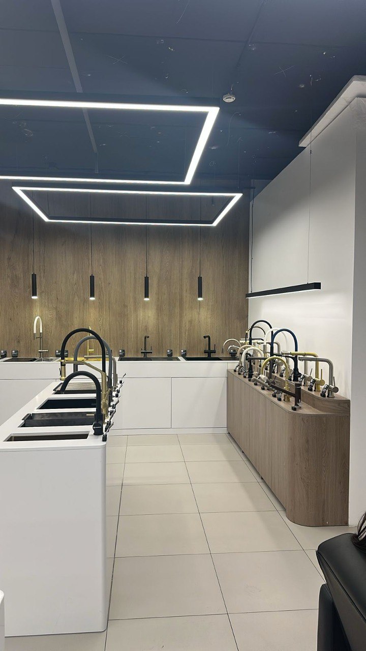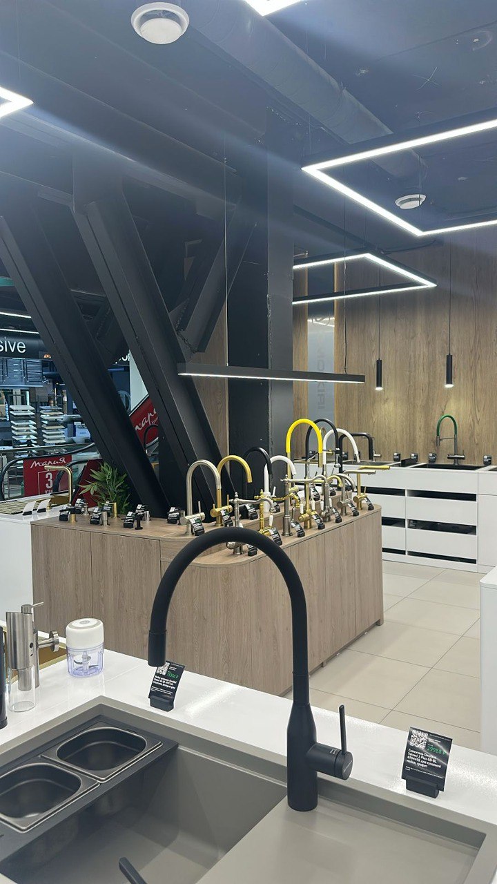 Во-первых, обеспечить равномерное освещение всего пространства. Освещение торговых залов должно быть достаточно ярким, чтобы покупатели могли детально рассмотреть товары, оценить качество покрытия смесителей, увидеть блеск хромированных поверхностей. Торговые светильники в этом проекте должны были создать оптимальный уровень освещенности согласно нормам для торговых помещений.