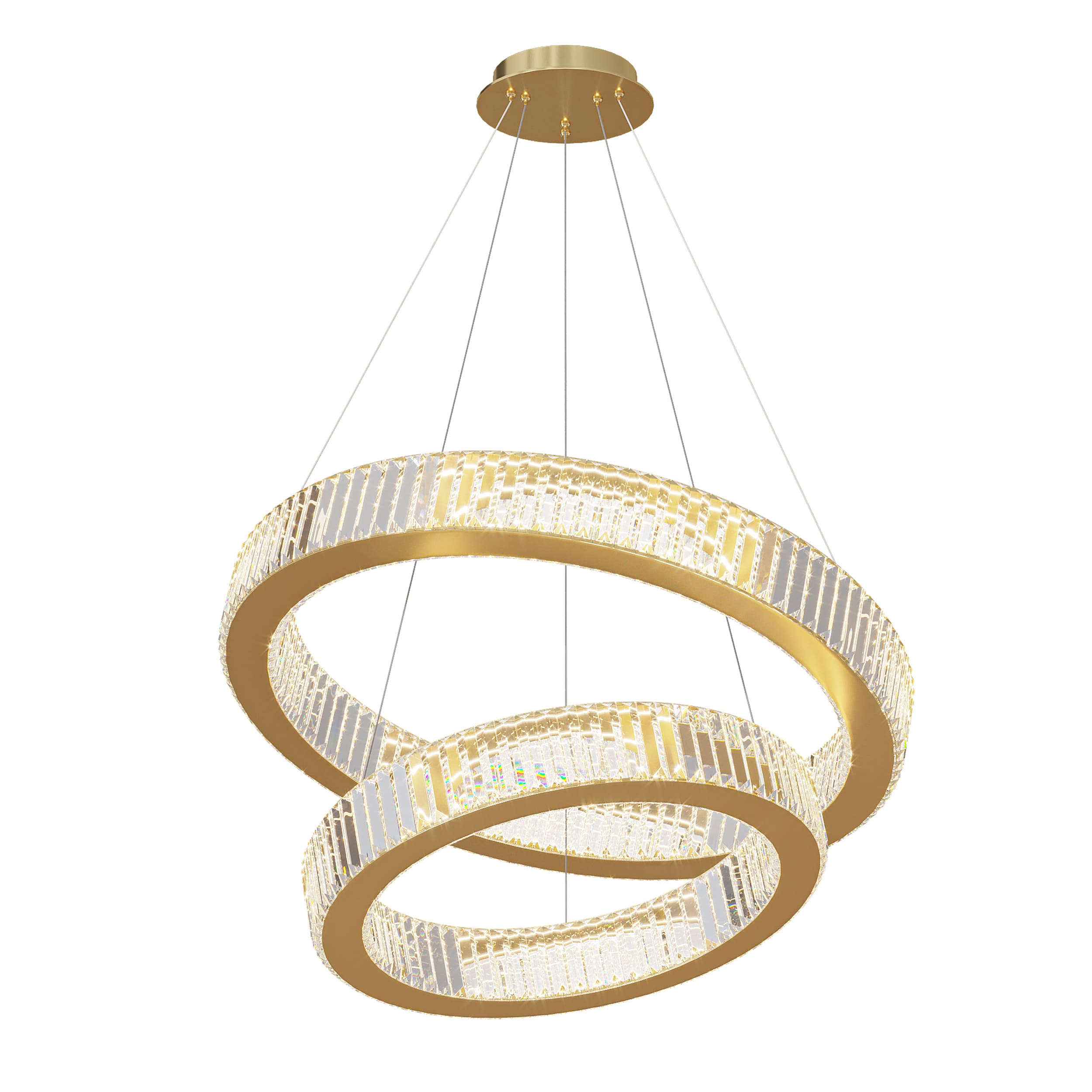 Подвесная каскадная люстра из светодиодных колец с прозрачными рассеивателями в виде прямоугольных хрустальных пластин золотая D60+80 3000К BERTOLDA