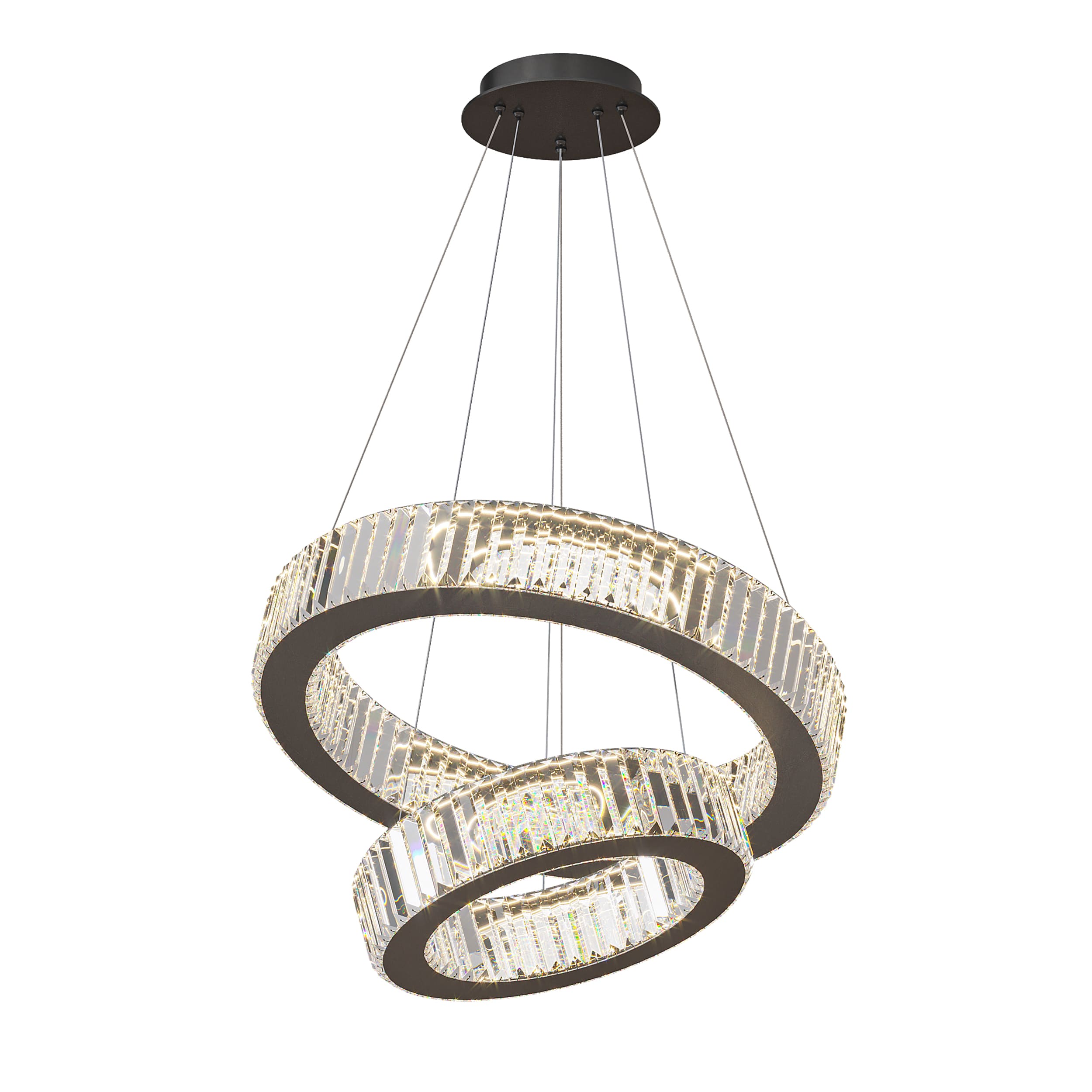Каскадная люстра BERTOLDA - настоящее произведение искусства, которое идеально сочетает элегантность и высокую функциональность. Люстра состоит из двух светодиодных колец диаметром 400 и 600 мм, украшенных прозрачными рассеивателями в виде прямоугольных хрустальных пластин. Эти рассеиватели создают потрясающий световой эффект, который добавляет нотку роскоши в любое помещение.