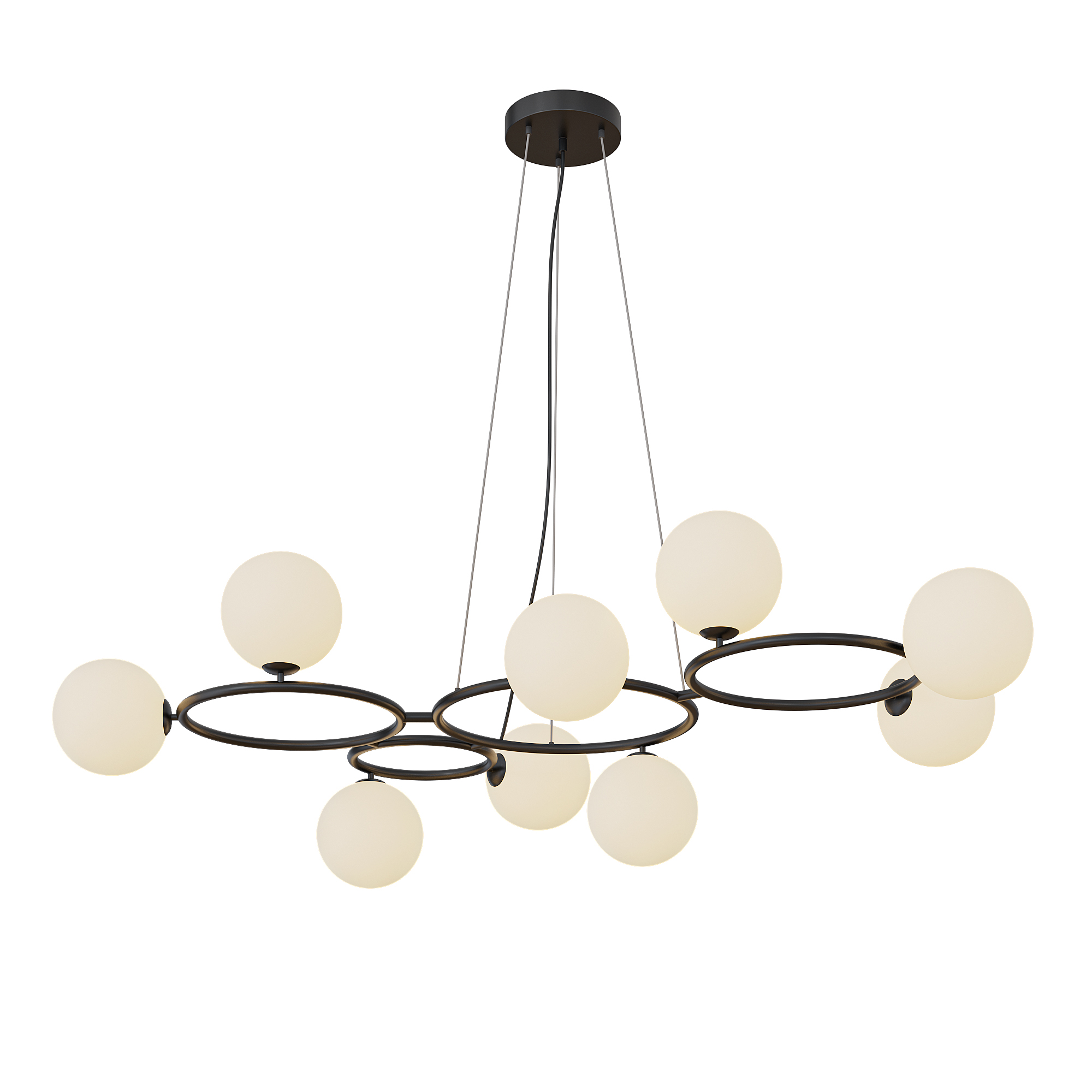Подвесная многокольцевая люстра Bubbles 9 шаров — эффектная композиция для современных интерьеров, в которой несколько тонких колец и светящиеся сферы создают объёмный, «парящий» силуэт. Опаловые плафоны дают мягкий равномерный свет без бликов, а чёрный металлический каркас добавляет графичности и подчёркивает архитектуру пространства, делая модель уместной в гостиной, столовой зоне, холле, лестничном пролёте или стильном коммерческом интерьере с высокой посадкой. Многокольцевая форма создаёт выразительный центр притяжения, но остаётся визуально лёгкой за счёт лаконичного дизайна. Люстра совместима с лампами разных типов (в том числе LED), что позволяет подобрать тёплый, нейтральный или более холодный свет под ваши задачи и сценарии освещения. Регулируемый подвес (в зависимости от комплектации) помогает адаптировать высоту под конкретное помещение. Компактная потолочная чаша аккуратно скрывает крепёж и проводку, обеспечивая чистый, аккуратный вид. В каталоге нашего интернет-магазина представлены и другие дизайнерские подвесные люстры в схожей стилистике. Заказать подвесную люстру с шарами вы можете прямо сейчас в нашем интернет-магазине. Мы — производитель, а значит — контролируем качество, цену и сроки. Доставим по всей России и СНГ.